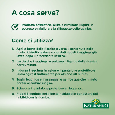 Prodotto cosmetico. Grazie alle sue caratteristiche osmotiche aiuta a eliminare i liquidi in eccesso e migliorare la silhouette delle gambe.