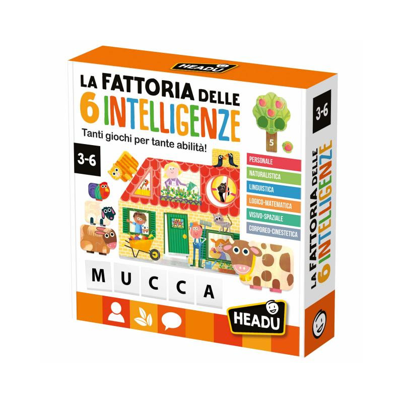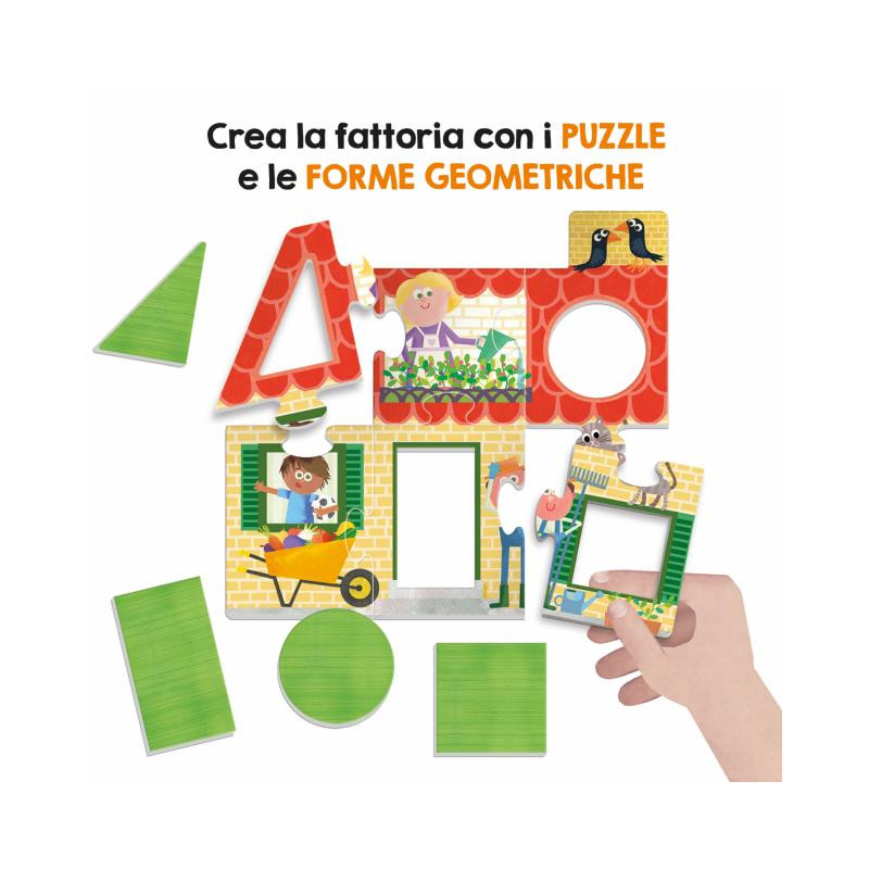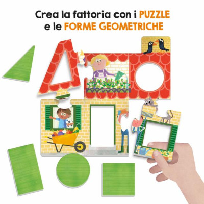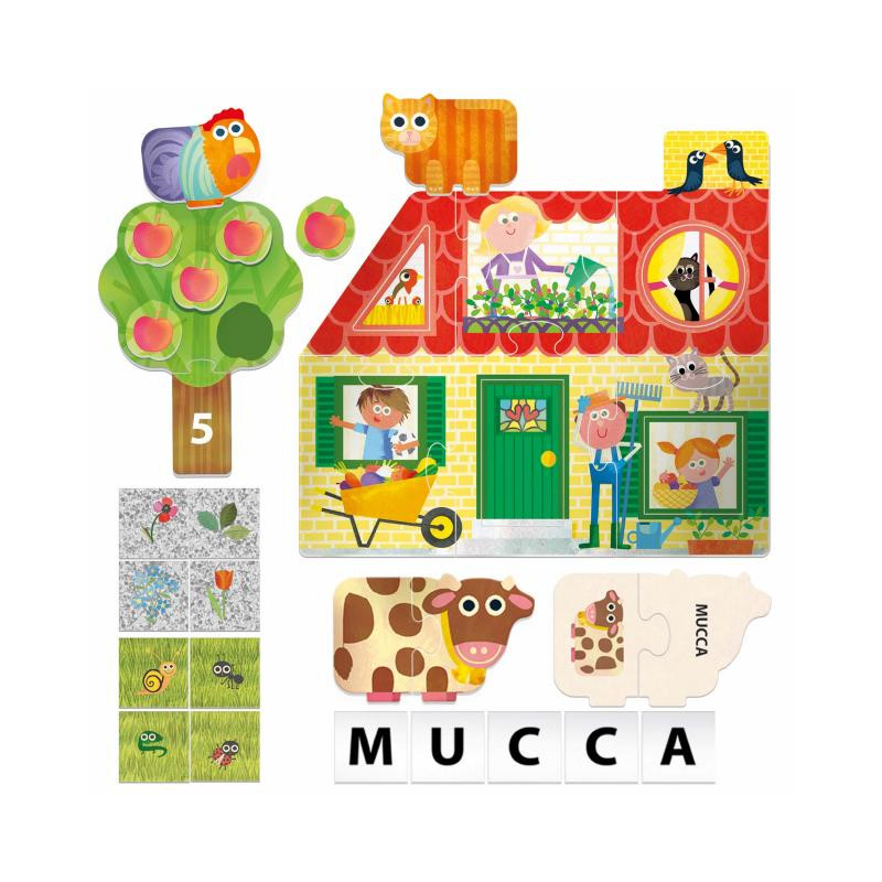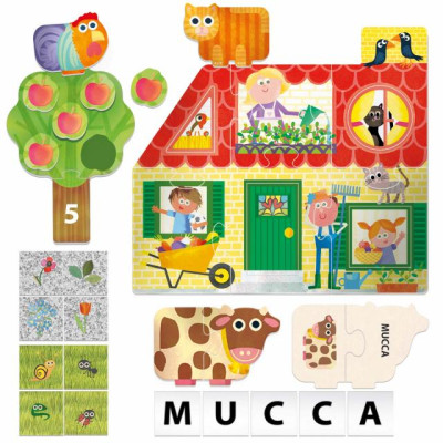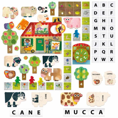 CONTENUTO 1 puzzle della fattoria con 4 forme geometriche ad incastro; 12 puzzle degli animali e delle parole; 5 alberi dei numeri e delle quantità con 15 frutti sagomati; 36 tessere double face lettere-percorso; 1 mulino-spinner; 4 pedoni; guida didattica.
