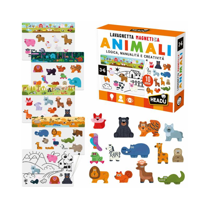 CONTIENE: 1 lavagnetta magnetica; 40 animali sagomati; 4 tessere-ambiente; 50 bottoni magnetici; 1 pennarello cancellabile; Istruzioni