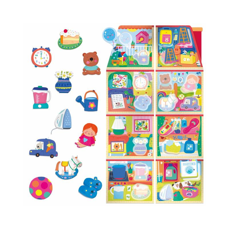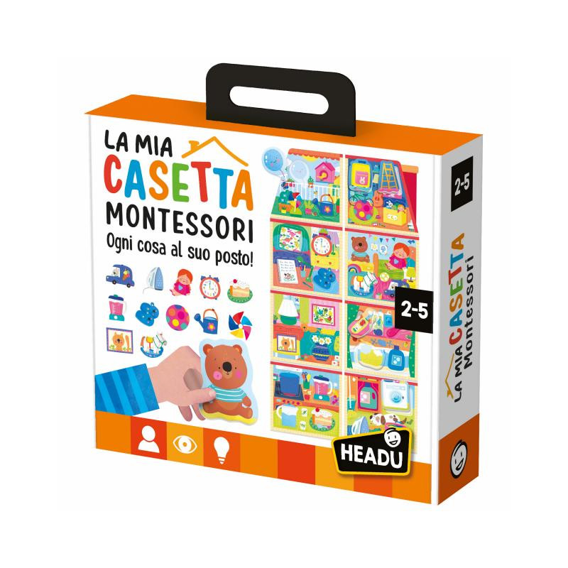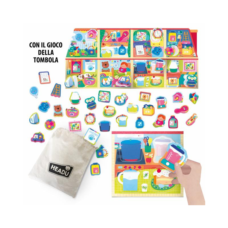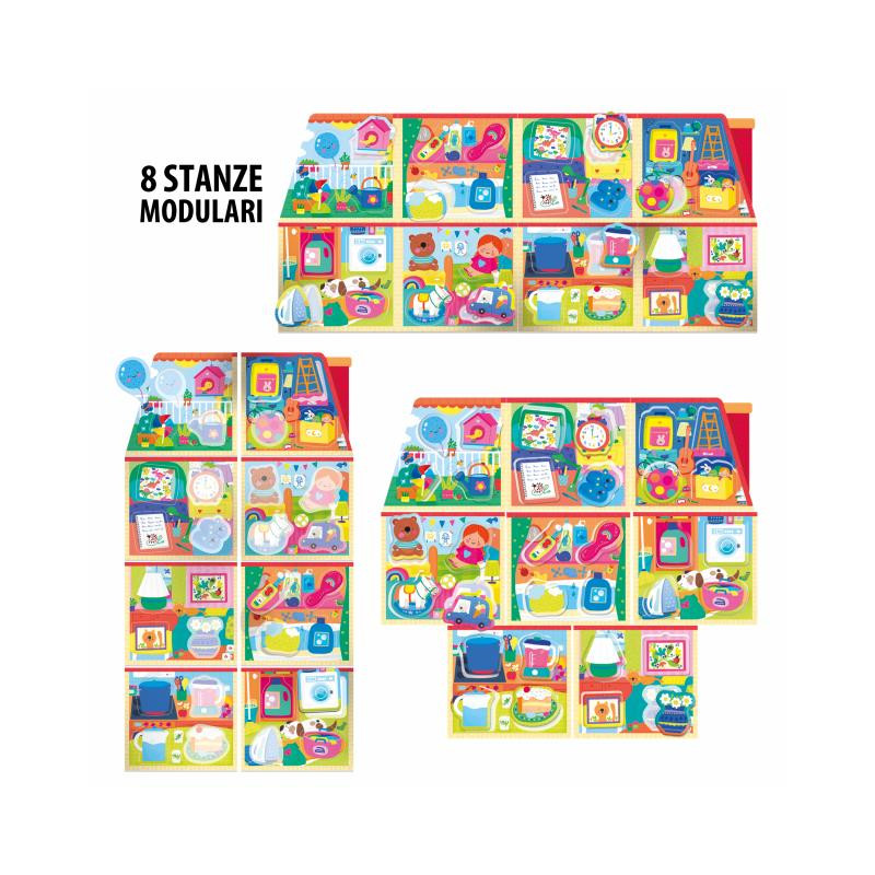 contiene Casetta da ricomporre con 8 cartelle-ambiente; 32 elementi sagomati; Sacchetto in tessuto
