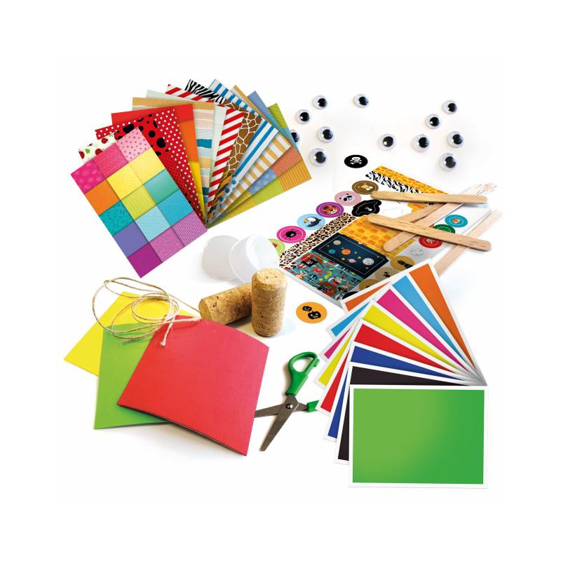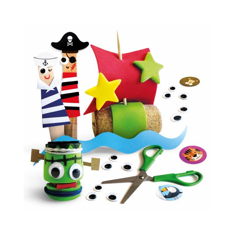 contenuto 8 cartoncini colorati; Pattern colorati; 2 tappi di sughero; 5 bastoncini di legno; 3 fogli adesivi in foam; 2 tappi di palstica; Spago; Occhietti adesivi; Forbici; Basi di cartone; Sticker; Istruzioni