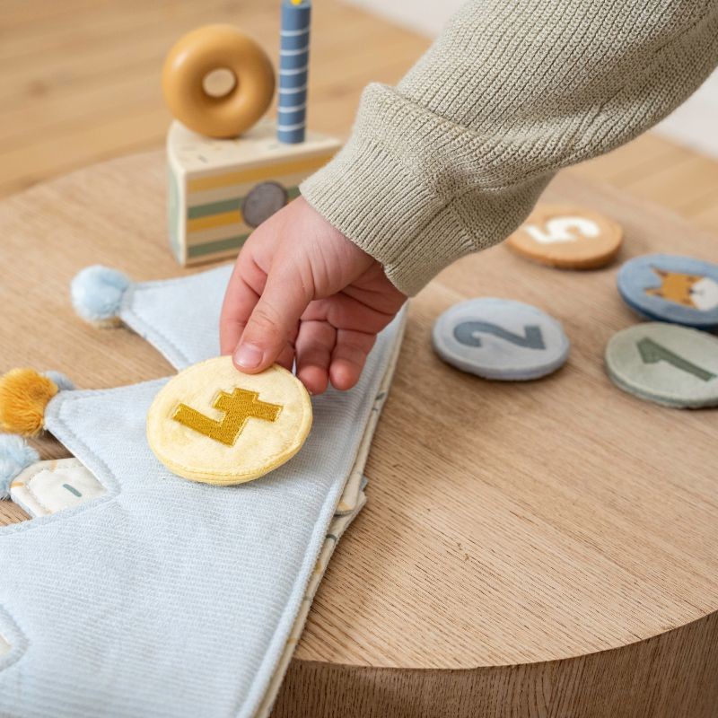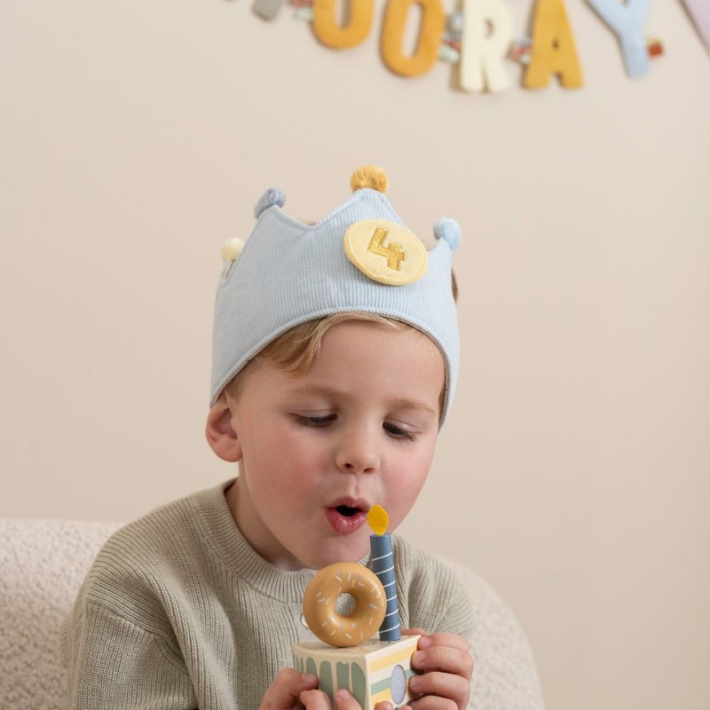 Buon compleanno! Festeggia con stile con questa adorabile corona di compleanno e cospargi un po' di magia da favola nel tuo giorno speciale. Viene fornito con numeri intercambiabili da 1 a 5, che lo rendono perfetto per i traguardi di crescita del tuo piccolo. Attacca il numero del compleanno alla corona e cattura quei momenti preziosi! Oppure opta per la toppa con la volpe quando il tuo piccolo vuole essere il re o la regina del paese delle meraviglie di tutti i giorni. La corona è realizzata in morbido tessuto imbottito e a coste di colore azzurro sormontato da pompon colorati. La chiusura in velcro permette alla corona di adattarsi e crescere con il tuo bambino. Guarda il tuo piccolo indossare con orgoglio la corona, mostrando la sua età con ogni sorriso e risatina.