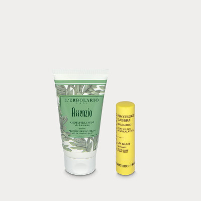 La Crema per le Mani Assenzio, formulata con estratti tonificanti di Assenzio, Dragoncello e Genepì, è proposta in questo kit in abbinamento al Balsamo labbra protettivo con Olivo e Melaleuca, in omaggio.