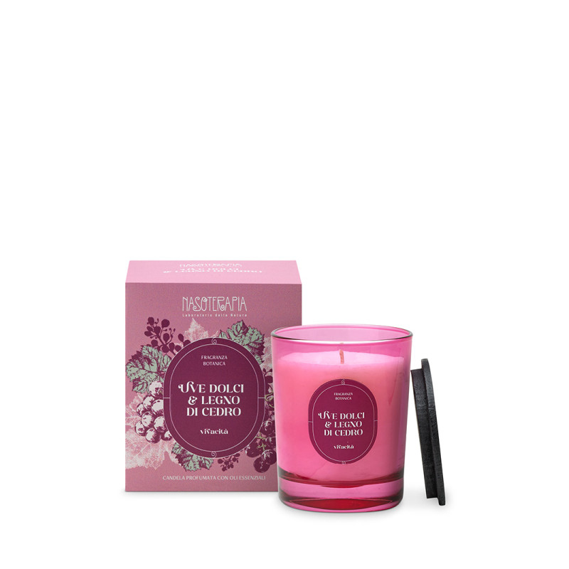 Un vivace e brioso bouquet di uve dolci, legni pregiati e note fruttate si sprigiona da questa candela profumata, realizzata a mano in Italia con cere vegetali e oli essenziali puri. La fragranza botanica Uve Dolci & legno di Cedro, studiata dai nostri maestri profumieri, è un delicato invito a immergersi nelle atmosfere autunnali, ricche di sentori di vendemmia, in una natura che cambia colore.
