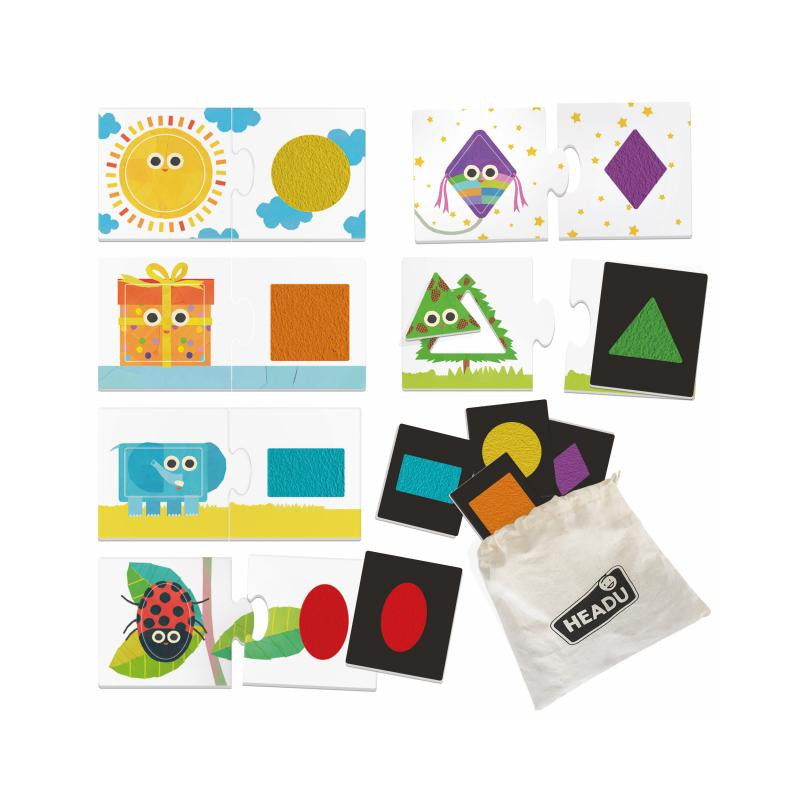 contenuto 6 associazioni; 6 tessere-forma sagomate; 6 tessere tattili; Sacchetto in cotone