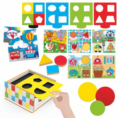 contenuti 1 banchetto sensoriale in legno; 16 forme in legno; 5 schede delle forme; 6 puzzle delle forme; 1 base di appoggio; Guida didattica