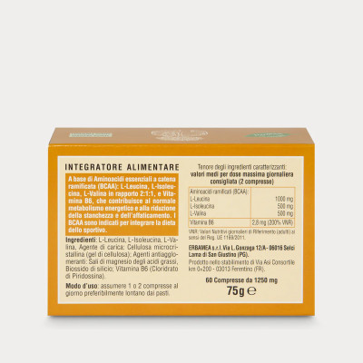 Integratore che contiene in ogni compressa 1 g di aminoacidi ramificati associati alla Vitamina B6, che contribuisce al normale metabolismo energetico e alla riduzione della stanchezza e dell’affaticamento.