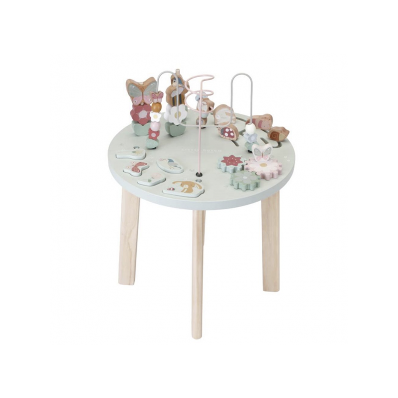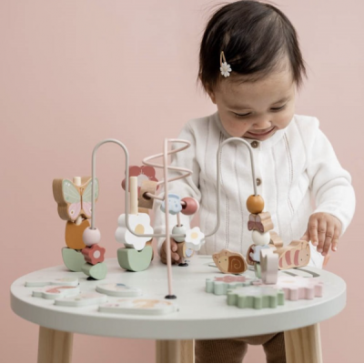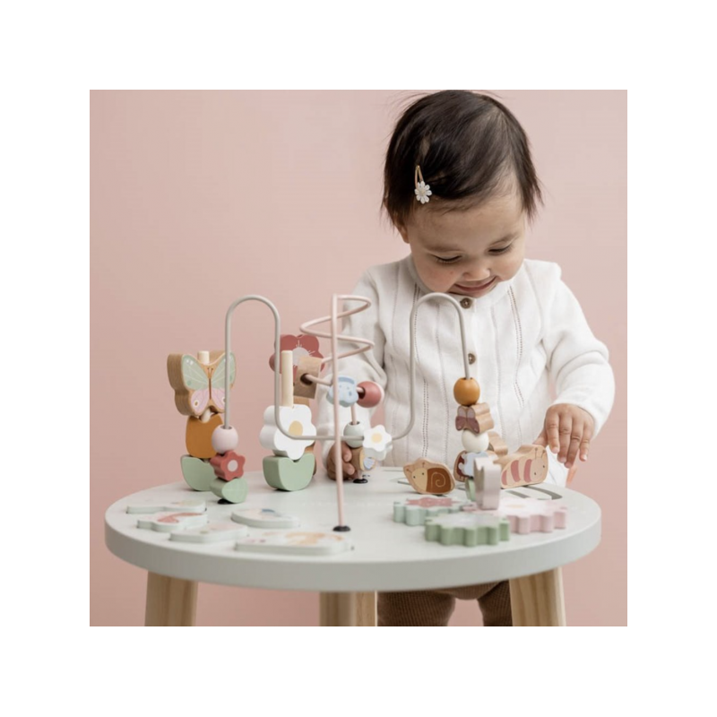 Alzati per giocare! Scopri tutte le tante attività che questo tavolo ha da offrire. Aiuta le farfalle a portare le perline lungo la spirale. Oppure costruisci una torre di fiori. Completa il puzzle, gira le ruote e attraversa i campi fioriti con il coniglietto, il bruco o la coccinella. Questo tavolo multiattività in legno sfida il tuo piccolo in molti modi. Ci sono 5 attività da esplorare, ciascuna delle quali supporta lo sviluppo delle capacità motorie fini. Grazie al design sicuro ed equilibrato, il tavolo attività favorisce anche la posizione eretta. E stare sveglio! Perché le numerose funzionalità manterranno impegnato il tuo bambino per un po'.