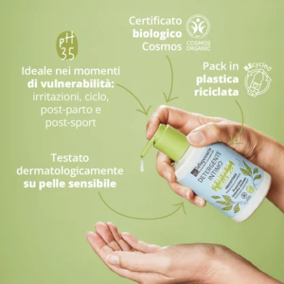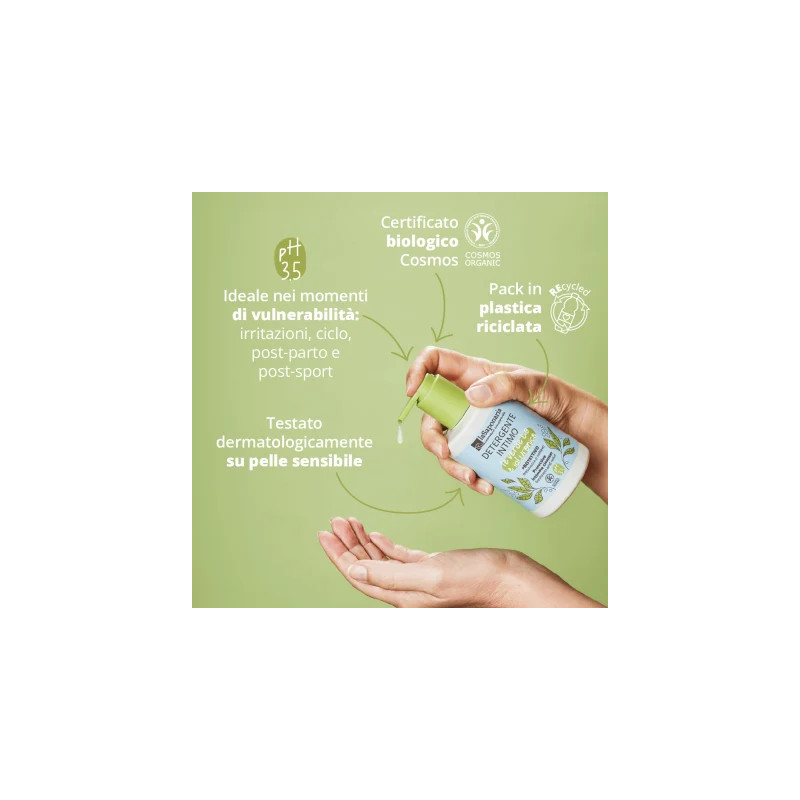 Questo delicato detergente, formulato per assicurare dolcezza e protezione alle zone intime più sensibili e rispettarne la fisiologica acidità, vanta le proprietà di efficacissimi attivi vegetali. Gli oli essenziali di Tea tree (Melaleuca alternifolia), Lavanda, Menta e Pino, svolgono un'azione purificante e, in associazione con gli estratti di Aloe, Camomilla, Calendula, Amamelide e Mentolo naturale, donano un effetto emolliente e una piacevole sensazione rinfrescante.